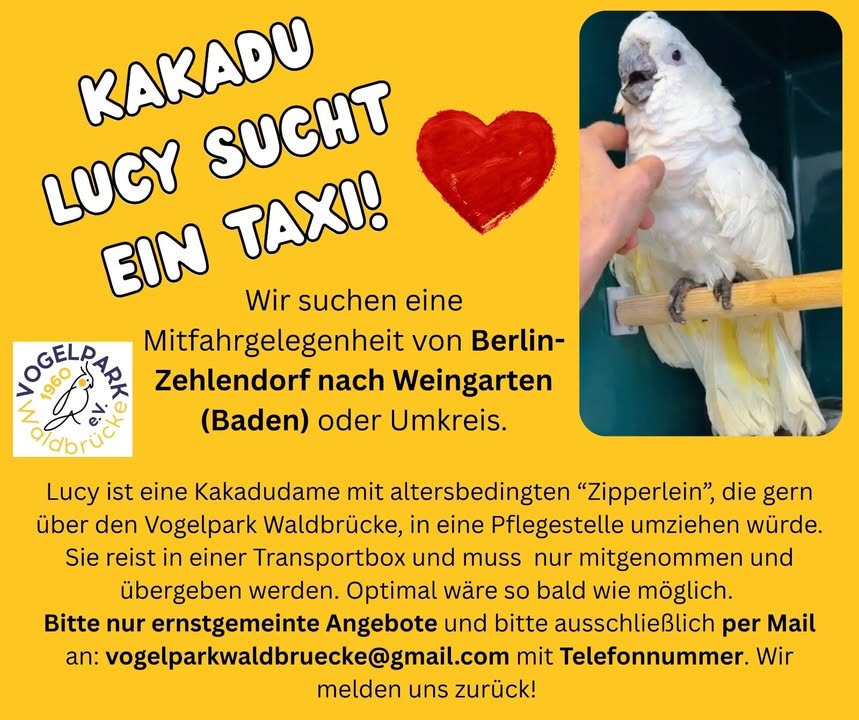 Wer kann Lucy von Berlin-Zehlendorf nach Weingarten (Baden) oder Umkreis mitnehmen? Wann? Sobald wie möglich Kontakt: vogelparkwaldbruecke@gmail.com bitte mit Telefonnummer, wir melden uns zurück. 🦜💕🦜 Bitte auch gerne teilen! 😍 #vogelparkwaldbrücke #taxigesucht #tiertaxi #mitfahrgelegenheit #kakadusuchttaxi