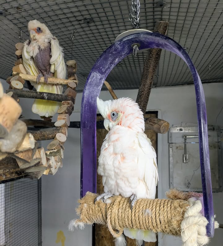 Grüße von Mogli und Filou, sie lieben ihre Stammplätze und vor allem die lila Schaukel. 🐦💕🐦 #stammplatz #lieblingsplatz #vogelparkwaldbrücke #meinortweingarten #weingartenbaden #papagei #papageienliebe #birdsofinstagram #tierliebe #featherfriends #vogelperspektive #kakaduliebe #instabird #parrotlovers #papageienschutz